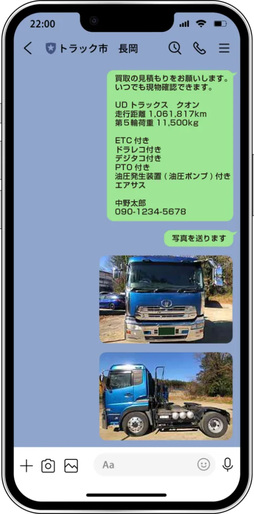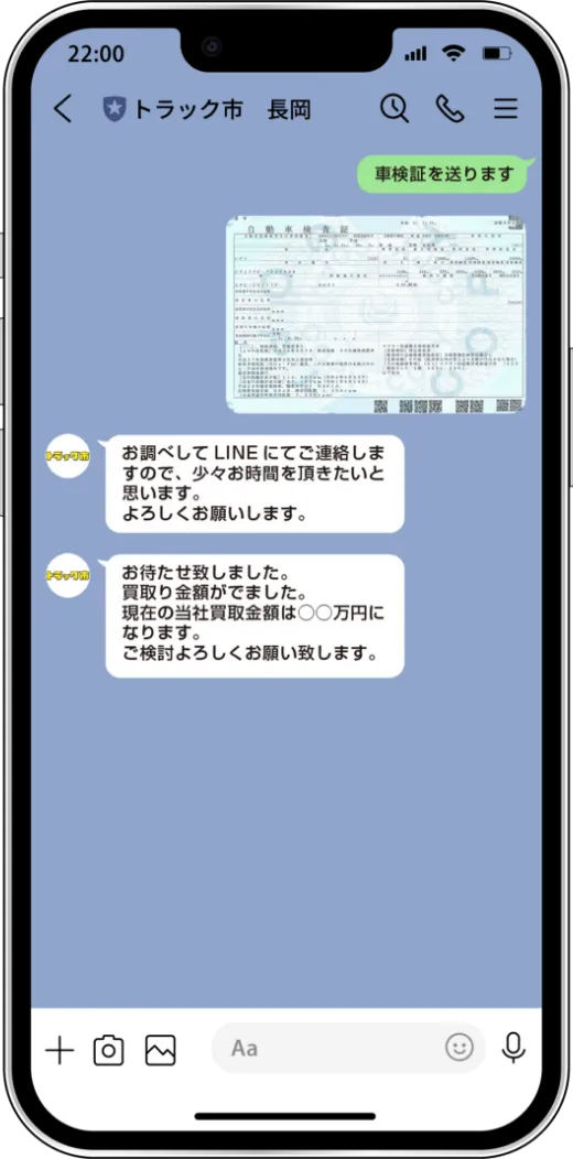 車検証や必要事項をトーク画面に送っていただくと、かんたん買取査定ができます。